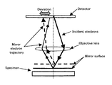 - FIG. 4 is a diagram illustrating a method of calculating, based on the trajectory of the mirror electrons, deviation of an axis of an electron beam from an objective lens;