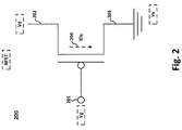 NFET 200 comprises gate 201, source 203 and drain 202. A corresponding gate voltage (Vg) may be applied to gate 201. A source voltage (Vs) may be applied/connected to source 203, and a drain voltage (Vd) may be applied/connected to drain 202. When the voltage applied at the gate of NFET 200 is high, i.e., the voltage level representing a digital “1”, NFET 200 is turned on and becomes operational. Alternatively, when the voltage applied at the gate of NFET 200 is low, i.e., the voltage level representing a “0”, NFET 200 is turned off and becomes non-operational.