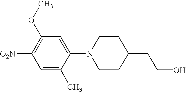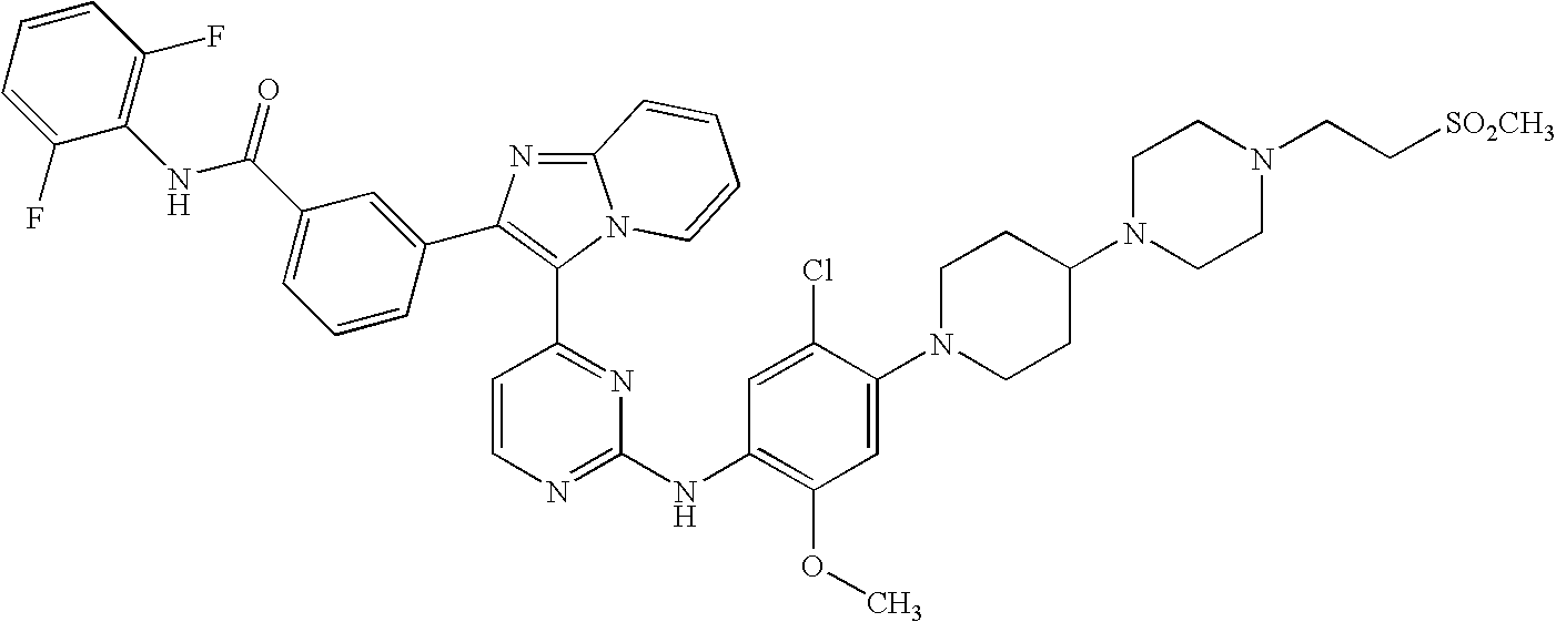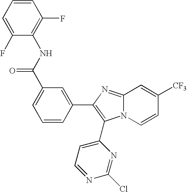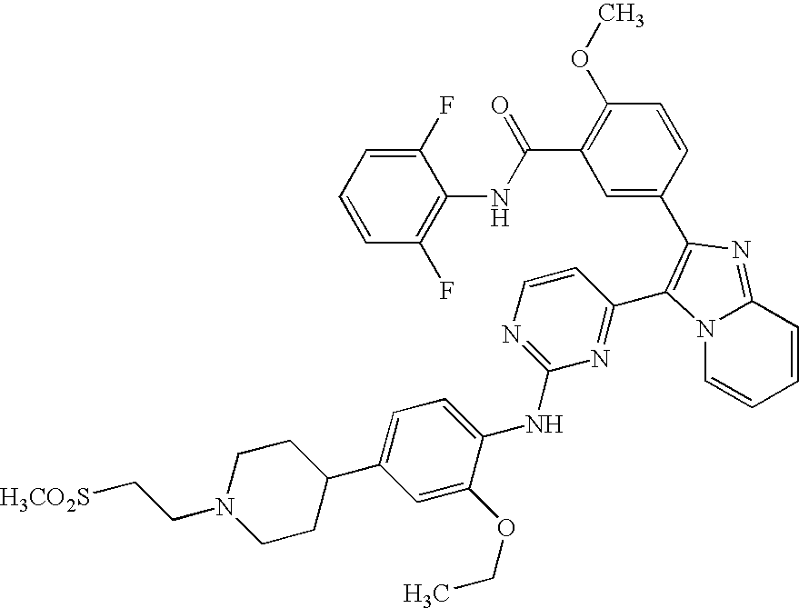 Due to the body weight loss seen with the higher doses in the Colo-205 xenograft efficacy study, the dosing regime was altered for the follow up BT474 study. Forty female nude mice bearing subcutaneous BT474 cell tumors (average tumor size of 200 mm3) were randomized into five groups each containing eight mice and dosed with either vehicle (20% SBE pH3.5) or Example 57 at 60, 30 or 15 mg/kg QD or 15 mg/kg BID for 21 days. Note the maximal QD dose was reduced from 100 mg/kg to 60 mg/kg and the BID dose reduced from 30 mg/kg to 15 mg/kg. In addition to these changes the mice in this study were given weekend holidays from dosing. Mice dosed with 60, 30, mg·kg QD×21 of Example 57 showed 37, 37 and 16% tumor growth inhibition respectively, while the 15 mg/kg BID×21 group showed 54% tumor growth inhibition. For all groups the mice displayed no body weight loss and appeared healthy and active throughout the study.