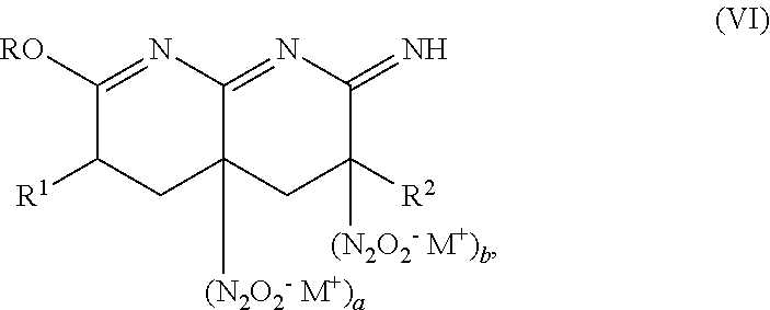 2, R, and M are as described above. For example, further reaction of a compound of formula (I) with NO produces a compound of formula (II). Compounds of formula (I) and (II) can undergo hydrolysis to form NO-releasing compounds of formula (III) and (IV), respectively, wherein R