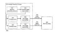 The charge pumps 240 and 242 are controllable by the programmable ring oscillator 230. In one embodiment of the invention, the charge pumps 240 and 242 provide a higher or boosted voltage to the write word line 150 and the read word line 152 respectively during a read or write operation of the memory array 260. The boosting ratio of the voltage, i.e., the ratio of the boosted voltage to the normal operating voltage, is determined by the control signals from programmable ring oscillator 230. In one embodiment of the invention, the programmable ring oscillator 230 sends control signals in the form of clock signals.