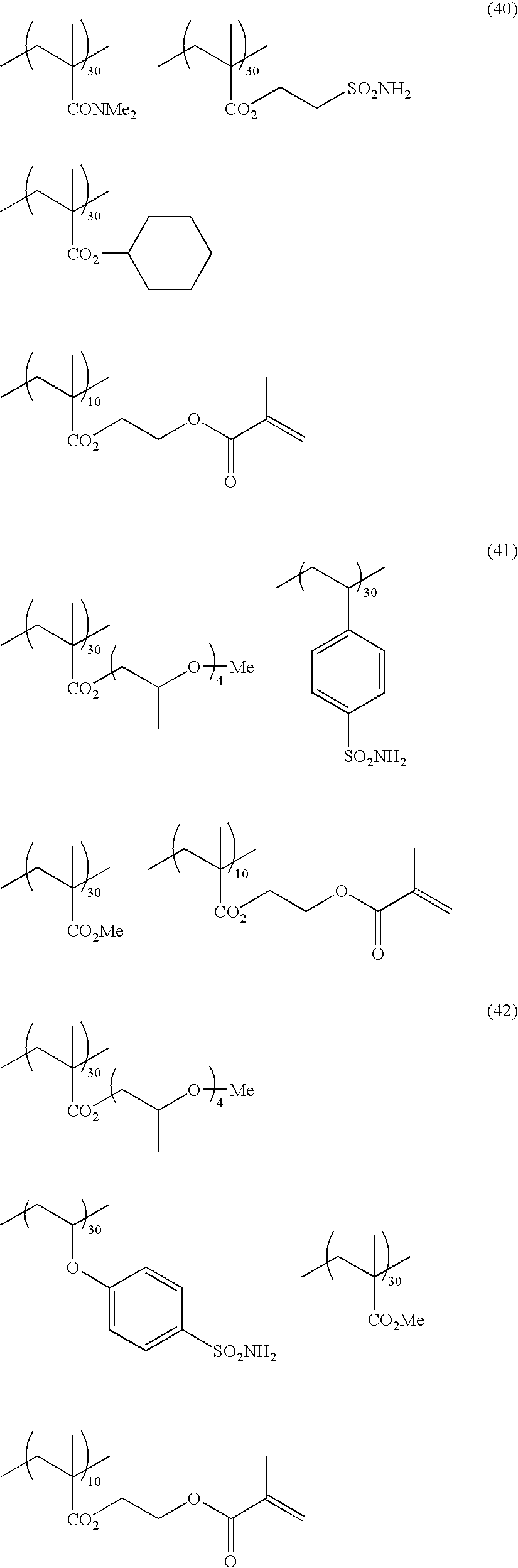 It is also hypothesized that the presence of the sulfonamide group or the cyclic structure derived from a maleimide in the polymer molecule facilitates dispersion in the aqueous component by the components that have been removed and thereby acts to prevent the removed components from making scum. In addition, the presence of the hydrophilic group accelerates these properties, and the presence of the ethylenically unsaturated bond makes a printing durability favorable, and further improves developability by increasing flexibility of the side chain of the polymer.