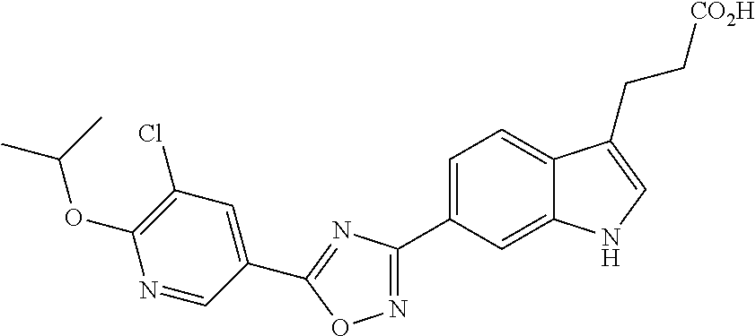- ZKMASJRQAZFHQB-UHFFFAOYSA-N CC(C)OC1=C(Cl)C=C(C2=NC(C3=CC=C4C(CCC(=O)O)=CNC4=C3)=NO2)C=N1 Chemical compound CC(C)OC1=C(Cl)C=C(C2=NC(C3=CC=C4C(CCC(=O)O)=CNC4=C3)=NO2)C=N1 ZKMASJRQAZFHQB-UHFFFAOYSA-N 0.000 description 1