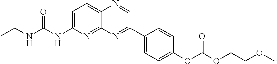 Further examples of 6- and 7-urea-substituted pyrido[2,3-b]pyrazines are reported in the patent WO 05/056547 (Bemis et al.). However, the compounds in this patent have additional carbonyl, sulphoxy, sulphone or imine substitution in the 2- or 3-position, which means that the compounds differ structurally significantly from the inventive pyrido[2,3-b]pyrazines described in this invention. The pyridopyrazines reported in WO 05/056547 are described as inhibitors of protein kinases, especially of GSK-3, Syk and JAK-3. For these compounds, the uses reported include use in the treatment of proliferative disorders. Use of these compounds as modulators of lipid kinases, alone or in combination with serine/threonine kinases, is not described.