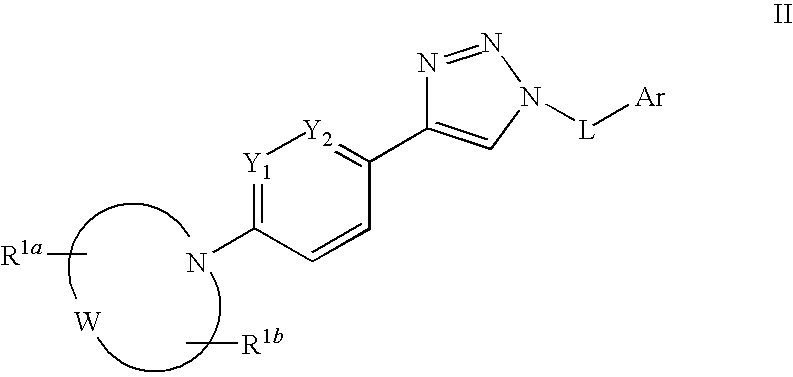 In formula I, W completes an imidazole, triazole or pyrazole ring, said ring necessarily being connected to the rest of the molecule via one of its ring nitrogens. Most suitably W completes an imidazole or triazole ring, in particular 1H-imidazol-1-yl or 1H-imidazol-1,2,4-triazol-1-yl. R1a and R1b independently represent H, C1-6alkyl or CF3, in particular H, methyl or CF3. In a particular embodiment at least one of R1a and R1b is other than H. Specific examples of groups completed by W, R1a and R1b include 4-methyl-1H-imidazol-1-yl, 2-methyl-1H-imidazol-1-yl, 2,4-dimethyl-1H-imidazol-1-yl, 4-trifluoromethyl-1H-imidazol-1-yl, 1H-imidazol-1-yl, 3-methyl-1H-1,2,4-triazol-1-yl and 4-methyl-1H-pyrazol-1-yl. In a particular embodiment W, R1a and R1b complete a 4-methyl-1H-imidazol-1-yl group.