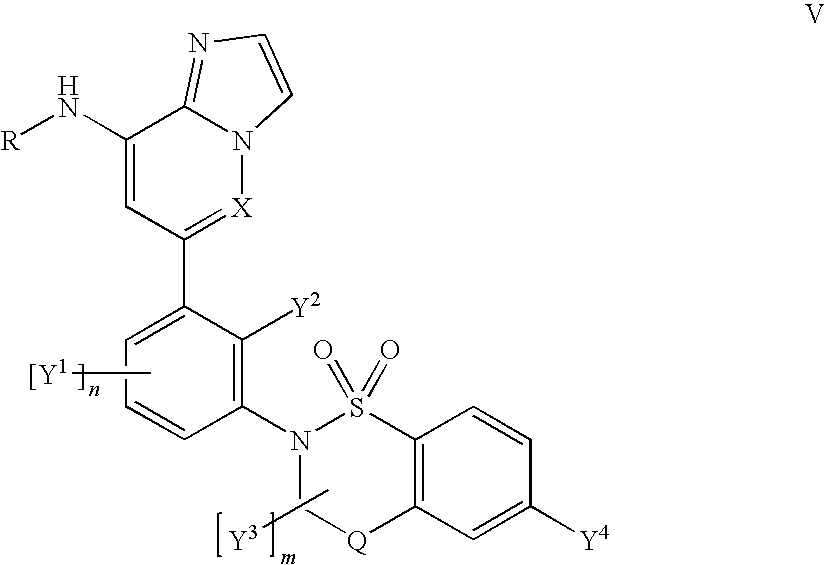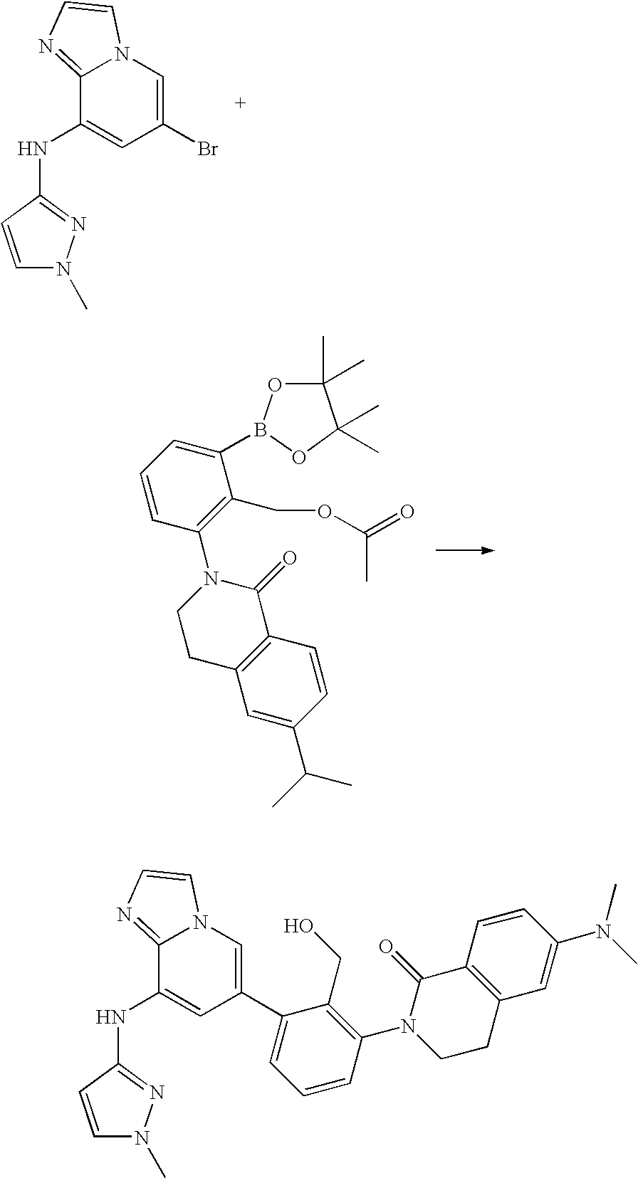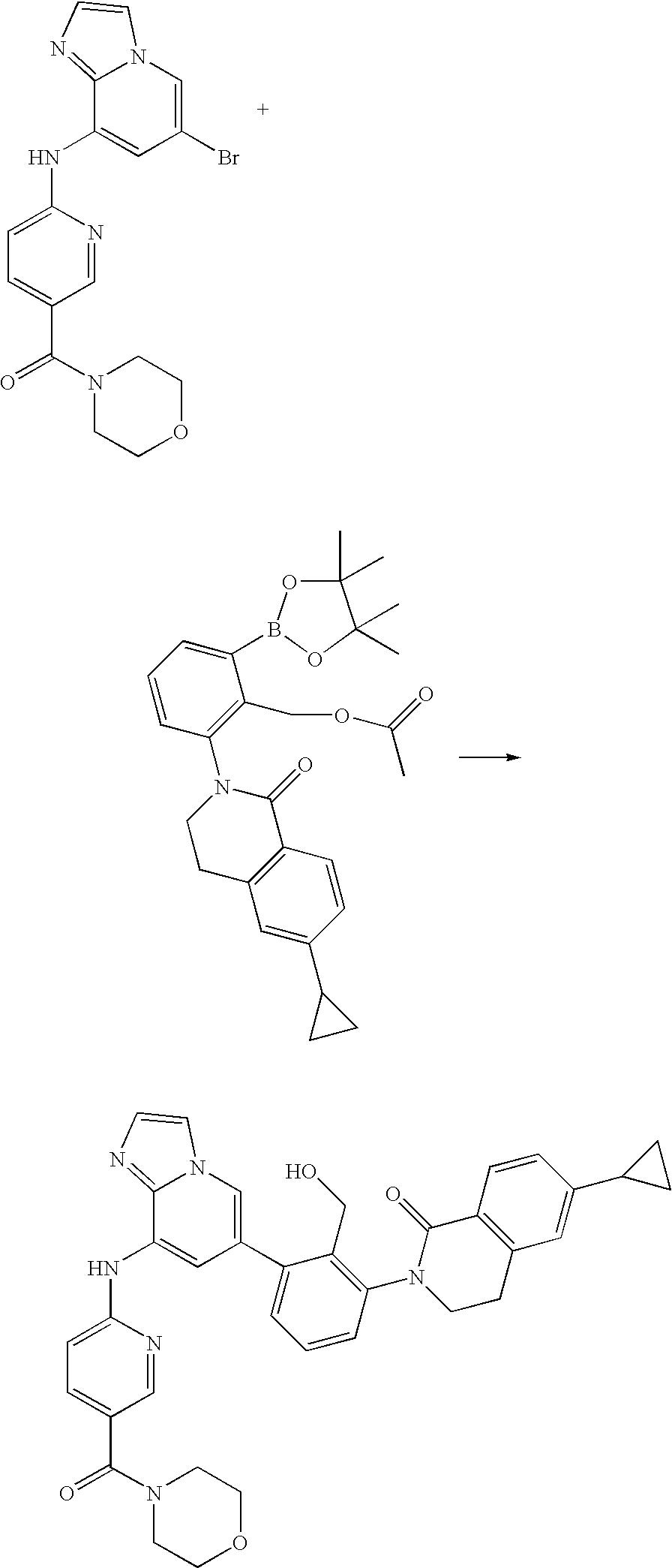 - 6-Cyclopropyl-2-(2-hydroxymethyl-3-{8-[5-(morpholine-4-carbonyl)-pyridin-2-ylamino]-imidazo[1,2-a]pyridin-6-yl}-phenyl)-3,4-dihydro-2H-isoquinolin-1-one.