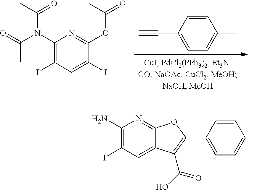 The term “heteroaryl” also refers to a group in which a heteroaromatic ring is fused to one or more aryl, cycloaliphatic, or heterocyclyl rings, where the radical or point of attachment is on the heteroaromatic ring. Nonlimiting examples include 1-, 2-, 3-, 5-, 6-, 7-, or 8-indolizinyl, 1-, 3-, 4-, 5-, 6-, or 7-isoindolyl, 2-, 3-, 4-, 5-, 6-, or 7-indolyl, 2-, 3-, 4-, 5-, 6-, or 7-indazolyl, 2-, 4-, 5-, 6-, 7-, or 8-purinyl, 1-, 2-, 3-, 4-, 6-, 7-, 8-, or 9-quinolizinyl, 2-, 3-, 4-, 5-, 6-, 7-, or 8-quinoliyl, 1-, 3-, 4-, 5-, 6-, 7-, or 8-isoquinoliyl, 1-, 4-, 5-, 6-, 7-, or 8-phthalazinyl, 2-, 3-, 4-, 5-, or 6-naphthyridinyl, 2-, 3-, 5-, 6-, 7-, or 8-quinazolinyl, 3-, 4-, 5-, 6-, 7-, or 8-cinnolinyl, 2-, 4-, 6-, or 7-pteridinyl, 1-, 2-, 3-, 4-, 5-, 6-, 7-, or 8-4-aH carbazolyl, 1-, 2-, 3-, 4-, 5-, 6-, 7-, or 8-carbzaolyl, 1-, 3-, 4-, 5-, 6-, 7-, 8-, or 9-carbolinyl, 1-, 2-, 3-, 4-, 6-, 7-, 8-, 9-, or 10-phenanthridinyl, 1-, 2-, 3-, 4-, 5-, 6-, 7-, 8-, or 9-acridinyl, 1-, 2-, 4-, 5-, 6-, 7-, 8-, or 9-perimidinyl, 2-, 3-, 4-, 5-, 6-, 8-, 9-, or 10-phenathrolinyl, 1-, 2-, 3-, 4-, 6-, 7-, 8-, or 9-phenazinyl, 1-, 2-, 3-, 4-, 6-, 7-, 8-, 9-, or 10-phenothiazinyl, 1-, 2-, 3-, 4-, 6-, 7-, 8-, 9-, or 10-phenoxazinyl, 2-, 3-, 4-, 5-, 6-, or I-, 3-, 4-, 5-, 6-, 7-, 8-, 9-, or 10-benzisoqinolinyl, 2-, 3-, 4-, or thieno[2,3-b]furanyl, 2-, 3-, 5-, 6-, 7-, 8-, 9-, 10-, or 11-7H-pyrazino[2,3-c]carbazolyl, 2-, 3-, 5-, 6-, or 7-2H-furo[3,2-b]-pyranyl, 2-, 3-, 4-, 5-, 7-, or 8-5H-pyrido[2,3-d]-o-oxazinyl, 1-, 3-, or 5-1H-pyrazolo[4,3-d]-oxazolyl, 2-, 4-, or 54H-imidazo[4,5-d]thiazolyl, 3-, 5-, or 8-pyrazino[2,3-d]pyridazinyl, 2-, 3-, 5-, or 6-imidazo[2,1-b]thiazolyl, 1-, 3-, 6-, 7-, 8-, or 9-furo[3,4-c]cinnolinyl, 1-, 2-, 3-, 4-, 5-, 6-, 8-, 9-, 10, or 11-4H-pyrido[2,3-c]carbazolyl, 2-, 3-, 6-, or 7-imidazo[1,2-b][1,2,4]triazinyl, 7-benzo[b]thienyl, 2-, 4-, 5-, 6-, or 7-benzoxazolyl, 2-, 4-, 5-, 6-, or 7-benzimidazolyl, 2-, 4-, 4-, 5-, 6-, or 7-benzothiazolyl, 1-, 2-, 4-, 5-, 6-, 7-, 8-, or 9-benzoxapinyl, 2-, 4-, 5-, 6-, 7-, or 8-benzoxazinyl, 1-, 2-, 3-, 5-, 6-, 7-, 8-, 9-, 10-, or 11-1H-pyrrolo[1,2-b][2]benzazapinyl. Typical fused heteroary groups include, but are not limited to 2-, 3-, 4-, 5-, 6-, 7-, or 8-quinolinyl, 1-, 3-, 4-, 5-, 6-, 7-, or 8-isoquinolinyl, 2-, 3-, 4-, 5-, 6-, or 7-indolyl, 2-, 3-, 4-, 5-, 6-, or 7-benzo[b]thienyl, 2-, 4-, 5-, 6-, or 7-benzoxazolyl, 2-, 4-, 5-, 6-, or 7-benzimidazolyl, and 2-, 4-, 5-, 6-, or 7-benzothiazolyl.