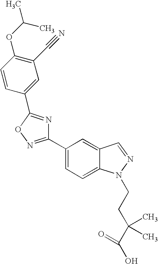 - AQSMJJZKKOHRGT-UHFFFAOYSA-N CC(C)OC1=C(Cl)C=C(C2=NC(C3=C4C=NN(CCC(C)(C)C(=O)O)C4=CC=C3)=NO2)C=N1 Chemical compound CC(C)OC1=C(Cl)C=C(C2=NC(C3=C4C=NN(CCC(C)(C)C(=O)O)C4=CC=C3)=NO2)C=N1 AQSMJJZKKOHRGT-UHFFFAOYSA-N 0.000 description 1