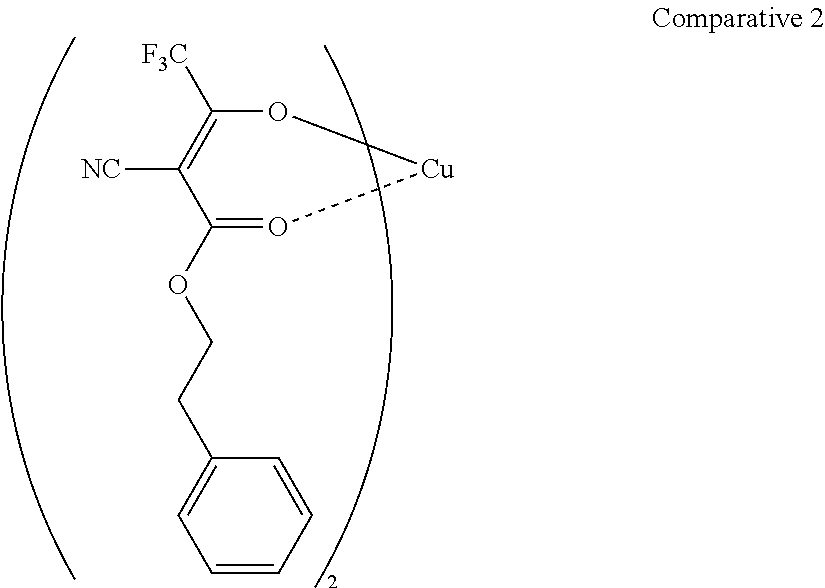 Typical concrete examples of the copper complex compound are listed below. The structure shown below is only one canonical structure among plural resonance structures capable of being taken by the compound, and the distinction between the covalent bond represented by—and the coordination bond represented by . . . is superficial and not absolute distinction.