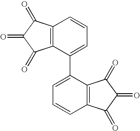 4,4′-bis(2,2-dimethoxy-1,3-dioxoindan-5-yl)biphenyl (30) (567 mg, 1.01 mmol) was suspended in a solvent mixture of 6 ml of acetic acid and 6 ml of water, and the suspension was mixed with 47% hydrobromic acid (6 ml). The mixture was refluxed at 100° C. over night. It was then cooled to room temperature and filtered to obtain a solid, which was washed with chloroform and water and dried. Thereafter, it was further cleaned with acetone and dried at a reduced pressure, to obtain 286 mg (55%) of 4,4′-bis(2,2-dihydroxy-1,3-dioxoindan-5-yl)biphenyl (31) in the form of a beige solid. The readings for this compound are as follows.