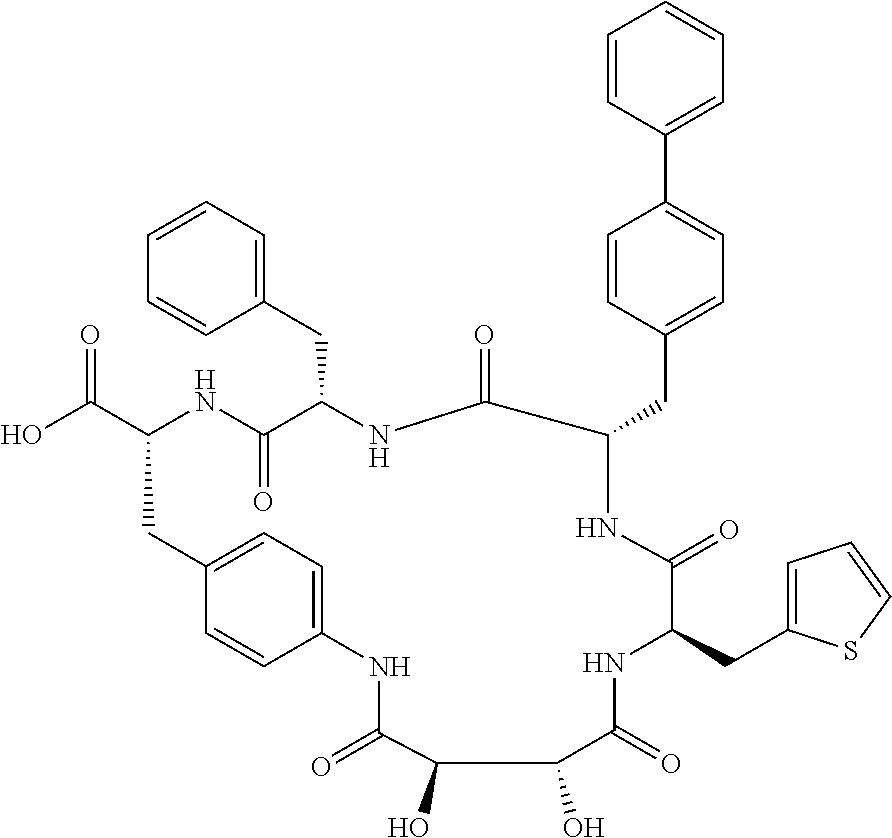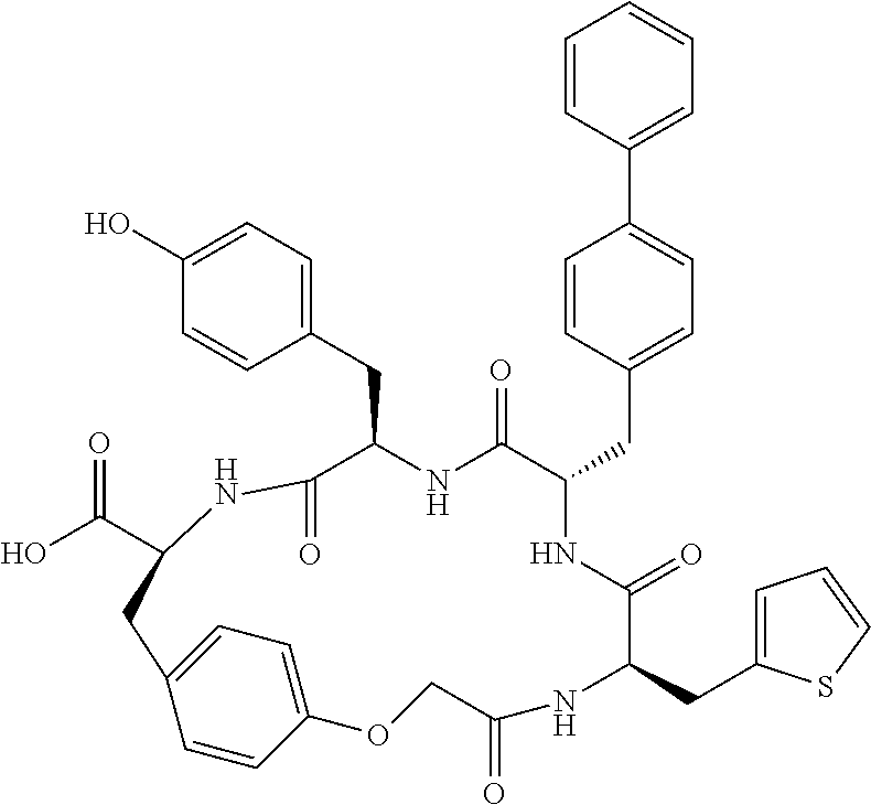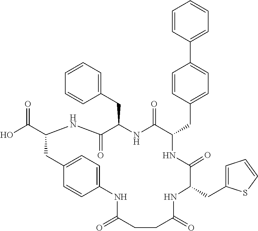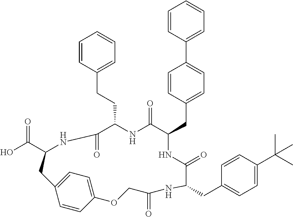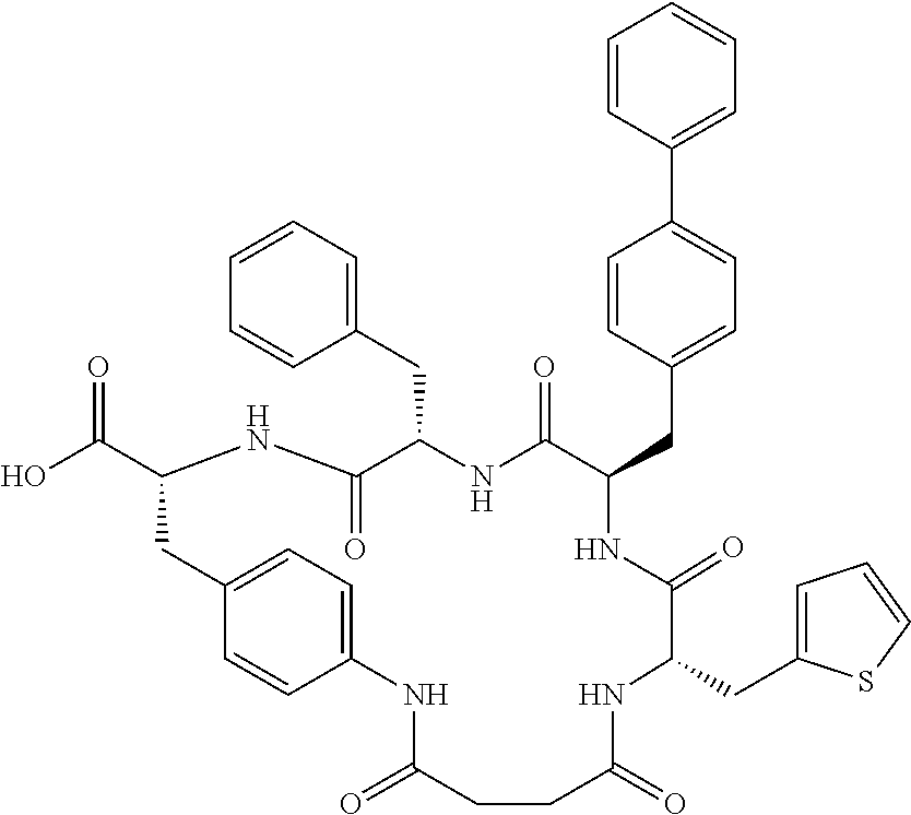 In certain instances, RA and RB each represent independently hydrogen, —CH3 or benzyl. In certain other instances, X1, X2, and X3 are each independently —CHR1— or —CHR1—CH2—, and each R1 is independently aryl, heteroaryl, benzofused-cycloalkyl, —(C1-C3)-alkyl-biphenyl, —(C1-C3)-alkyl-aryl, —(C1-C3)-alkyl-heteroaryl, —(C1-C3)-alkyl-O-aryl, —(C1-C3)-alkyl-O—(C1-C3)-alkyl-aryl, —(C1-C3)-alkyl-O—(C1-C3)-alkyl-heteroaryl, or —CH(aryl)(aryl), wherein each aryl or heteroaryl is optionally substituted with an additional aryl or heteroaryl, and any aryl or heteroaryl in R1 is optionally substituted with up to three substituents independently selected from the group consisting of halogen, —(C1-C4)-alkyl, —O—(C1-C4)-alkyl, —C(O)OH, —C(O)(C1-C4)alkyl, —OH, —NH2, —NH((C1-C4)-alkyl), and —N((C1-C4)-alkyl)2, —N(H)C(O)OR5, —N(H)C(O)N(R5)(R6), and —N(H)S(O)2R5. In certain other instances, the R1 substituent of X1 is in an (R) orientation; the R1 substituent of X2 is in an (S) orientation; and the R1 substituent of X3 is in an (R) orientation. In still other instances, the chiral center to which the R1 substituent of X1 is attached is in an (S) orientation; the chiral center to which the R1 substituent of X2 is attached is in an (R) orientation; and the chiral center to which the R1 substituent of X3 is attached is in an (S) orientation.