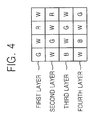 FIG. 3 is a diagram of a basic filter block of a color filter array according to example embodiments. Although not shown, the color filter array may include a plurality of 4×4 basic filter blocks arranged in all directions around the basic filter block shown in FIG. 3. Referring to FIG. 3, the basic filter block includes first through fourth layers.