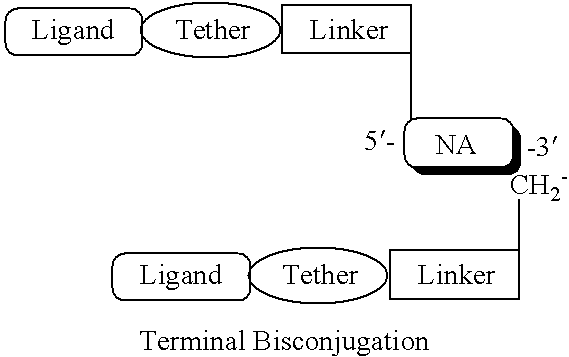 The carriers further include (i) at least two “backbone attachment points” and (ii) at least one “tethering attachment point.” A “backbone attachment point” as used herein refers to a functional group, e.g. a hydroxyl group, or generally, a bond available for, and that is suitable for incorporation of the carrier into the backbone, e.g., the phosphate, or modified phosphate, e.g., sulfur containing, backbone, of a ribonucleic acid. A “tethering attachment point” as used herein refers to a constituent ring atom of the cyclic carrier, e.g., a carbon atom or a heteroatom (distinct from an atom which provides a backbone attachment point), that connects a selected moiety. The moiety can be, e.g., a ligand, e.g., a targeting or delivery moiety, or a moiety which alters a physical property. One of the most preferred moieties is a moiety which promotes entry into a cell, e.g., a lipophilic moiety, e.g., cholesterol. While not wishing to be bound by theory it is believed the attachment of a lipophilic agent increases the lipophilicity of an oligonucleotide agent. Optionally, the selected moiety is connected by an intervening tether to the cyclic carrier. Thus, it will often include a functional group, e.g., an amino group, or generally, provide a bond, that is suitable for incorporation or tethering of another chemical entity, e.g., a ligand to the constituent ring.