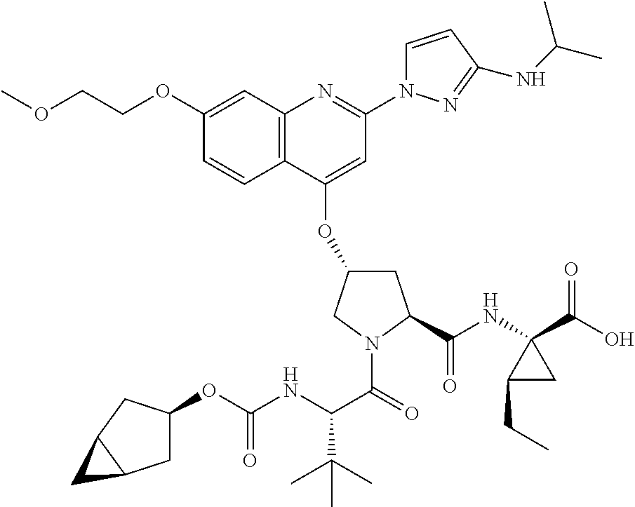 Purified NS3 protease is complexed with NS4A peptide and then incubated with serial dilutions of the compounds (DMSO used as solvent). Reactions are started by addition of dual-labeled peptide substrate and the resulting kinetic increase in fluorescence is measured. Non-linear regression of velocity data is performed to calculate IC50s. Activity is initially tested against genotype 1b protease. Depending on the potency obtained against genotype 1b, additional genotypes (1a, 2a, 3) and or protease inhibitor resistant enzymes (D168Y, D168V, or A156T mutants) may be tested. BILN-2061 is used as a control during all assays. The compounds of Examples 1-81 were evaluated in this assay and were found to have IC50 values of less than about 1 μM.