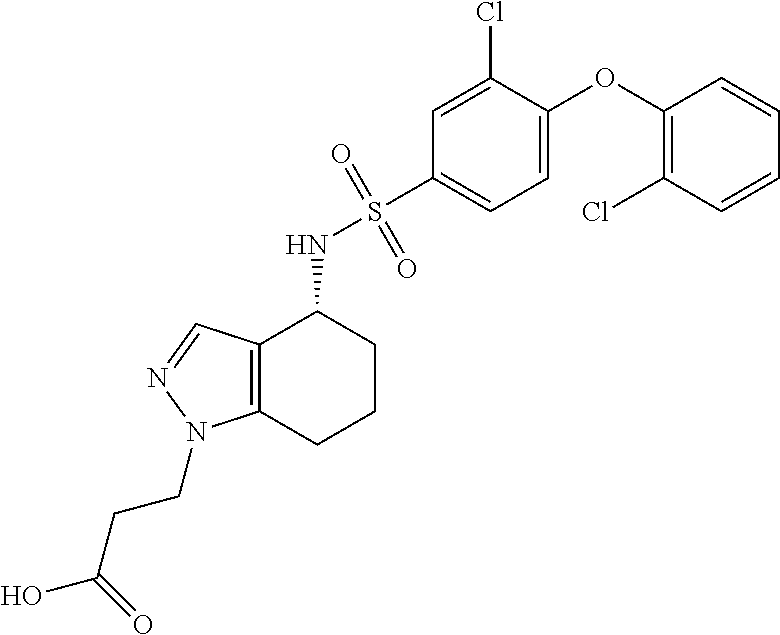 - GLFOMUKTMYBZID-OAQYLSRUSA-N CN([C@@H]1CCCC2=C1C=NN2CCC(=O)O)S(=O)(=O)C1=CC(S(=O)(=O)C2=CC=C(Cl)C=C2)=CC(C(F)(F)F)=C1 Chemical compound CN([C@@H]1CCCC2=C1C=NN2CCC(=O)O)S(=O)(=O)C1=CC(S(=O)(=O)C2=CC=C(Cl)C=C2)=CC(C(F)(F)F)=C1 GLFOMUKTMYBZID-OAQYLSRUSA-N 0.000 description 2