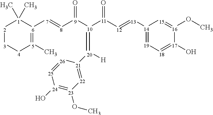 Also, homology structural model of the kinase domain of IKKβ (ribbon) in complex with Compound 10 (cyan stick), indicates that chain A forms two hydrogen bonds with residue Y169 and chain B forms three hydrogen bonds with the backbone atom (carbonyl oxygen) of A27, D174 and Q175 (FIG. 15A). In FIG. 15B, an overlay of the predicted bound compound 10 and PS-1145, a known IKKβ inhibitor, in the ATP-binding site of IKKβ, indicates that PS-1145 overlaps with the ionone core and chain B of compound 10; FIG. 15C shows the chemical structure of PS-1145 and compound 10.