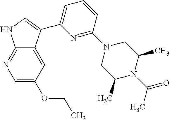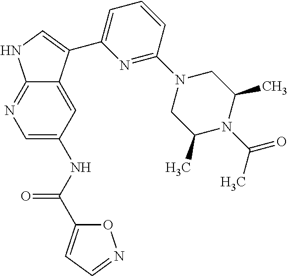In Tables 5 and 6, “A” represents a Ki of less than 0.5 μM, “B” represents a Ki of between 0.5 and 5.0 μM, and “C” represents a Ki greater than 5.0 μM for the indicated enzyme. If more than one value of Ki has been determined, the average Ki is indicated. If no value is indicated, then the Ki was not determined. For ROCK, the term “Enzyme” indicates that an enzyme-linked assay was used; the term “33P” indicates that a radioactive assay was used.