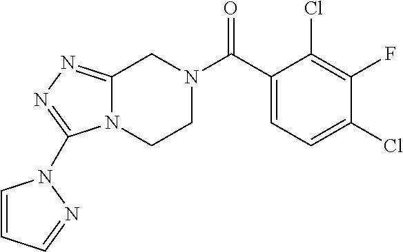 - ZIPLPYGIRYAFHV-UHFFFAOYSA-N O=C(C1=CC=C(Cl)C(F)=C1Cl)N1CCN2C(=NN=C2C2=NC=NC=C2)C1 Chemical compound O=C(C1=CC=C(Cl)C(F)=C1Cl)N1CCN2C(=NN=C2C2=NC=NC=C2)C1 ZIPLPYGIRYAFHV-UHFFFAOYSA-N 0.000 description 3