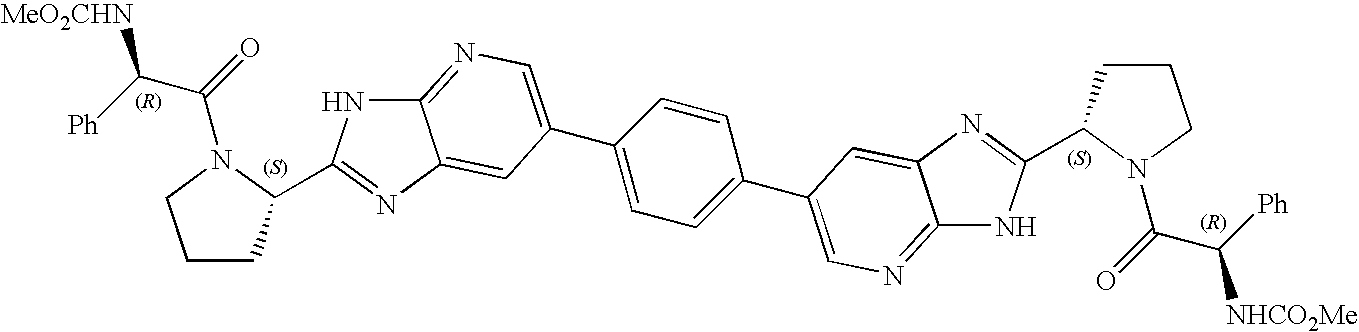Based on the foregoing, there exists a significant need to identify compounds with the ability to inhibit HCV. A general strategy for the development of antiviral agents is to inactivate virally encoded proteins, including NS5A, that are essential for the replication of the virus. The relevant patent disclosures describing the synthesis of HCV NS5A inhibitors are: US 2009/0202478; US 2009/0202483; WO 2009/020828; WO 2009/020825; WO 2009/102318; WO 2009/102325; WO 2009/102694; WO 2008/144380; WO 2008/021927; WO 2008/021928; WO 2008/021936; WO 2006/133326; WO 2004/014852; WO 2008/070447; WO 2009/034390; WO 2006/079833; WO 2007/031791; WO 2007/070556; WO 2007/070600; WO 2008/064218; WO 2008/154601; WO 2007/082554; and WO 2008/048589; the contents of each of which are expressly incorporated by reference herein.