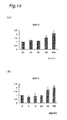 FIG. 13 shows by means of a bar graph the effects of NGF on the amount of ALPase mRNA expression in HPL cells; (A) is a graph showing the results of measuring the time course effect of NGF; the vertical axis of the graph plots the relative amount of ALPase mRNA expression for each exposure time of NGF, with the amount of ALPase mRNA expression for exposure time zero being taken as unity; the horizontal axis of the graph plots the exposure time of NGF; (B) is a graph showing the results of measuring the dose effect; the vertical axis of the graph plots the relative amount of ALPase mRNA expression at each concentration of NGF, with the amount of ALPase mRNA expression at zero concentration being taken as unity; the horizontal axis of the graph plots the concentration of NGF (ng/ml).