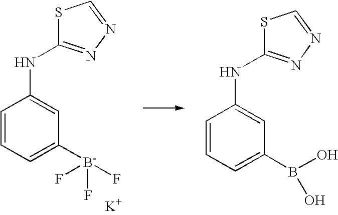 General Route A, procedure A1, procedure A2, procedure A3b using 3- ([1,3,4]Thiadiazol- 2-ylamino)-phenyl boronic acid pinacol ester (I4), procedure A4b using (3- methane sulfonylamino- methyl)benzene boronic acid |