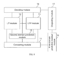 - a second-domain prediction module adapted to: obtain a second-domain predictive signal according to the LP signal and an LTP contribution signal if the obtained long-term flag is a first flag, or obtain a second-domain predictive signal according to the LP signal if the obtained long-term flag is not a first flag, wherein the LTP contribution signal is obtained according to the LP residual signal of the decoded sample point;