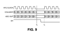 As with blocks 802 and 804, FIG. 9 shows graphically the operations described in blocks 806 and 806. When considered in the context of blocks 806 and 808, the SH signal should be regarded as the SHS signal. As shown in FIG. 9, some time before the end of the SHS sampling period (at time t5 in FIG. 9) both the AFE CLOCK and COLADDR are suspended, as described in block 806. Shortly after the end of SHS (at time tR in FIG. 9) AFE CLOCK and COLADDR resume, as described in block 808.