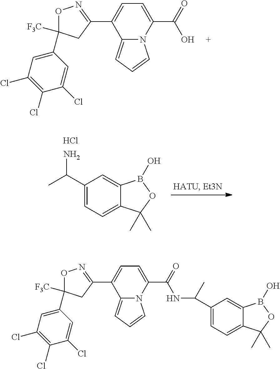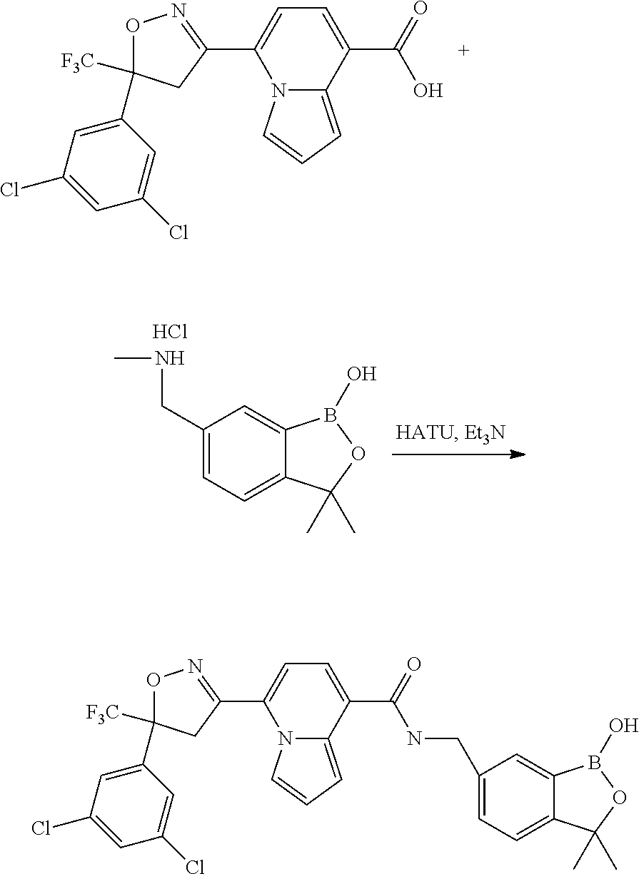 - DSBNLYWTJNOFIP-UHFFFAOYSA-N CC1(C)OB(O)C2=CC(CCN)=CC=C21.CC1(C)OB(O)C2=CC(CCNC(=O)C3=CC=C(C4=NOC(C)(C5=CC(Cl)=CC(Cl)=C5)C4)C4=CC=CN34)=CC=C21.CC1(C2=CC(Cl)=CC(Cl)=C2)CC(C2=CC=C(C(=O)O)N3C=CC=C23)=NO1.Cl Chemical compound CC1(C)OB(O)C2=CC(CCN)=CC=C21.CC1(C)OB(O)C2=CC(CCNC(=O)C3=CC=C(C4=NOC(C)(C5=CC(Cl)=CC(Cl)=C5)C4)C4=CC=CN34)=CC=C21.CC1(C2=CC(Cl)=CC(Cl)=C2)CC(C2=CC=C(C(=O)O)N3C=CC=C23)=NO1.Cl DSBNLYWTJNOFIP-UHFFFAOYSA-N 0.000 description 1