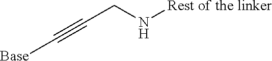 Coupling was carried out for 1 hour by spotting 7˜l of each oligonucleotide into one or more wells created by sticking a Grace Biolab CultureWell coverglass gasket (gasket 1, scheme 2) onto a Typhoon slide previously modified with 2% acrylamide, 2 mol % BRAPA silane-free acrylamide. During coupling the slides were kept in the dark in a humidity chamber. After coupling the slides were rinsed with 250 ml of 0.1 M phosphate buffer pH 7 from a wash bottle. Then each slide was vortexed 20 seconds in 10 mM/10 mM Tris/EDTA pH 8 buffer, then rinsed with MilliQ water and dried.