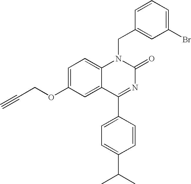 - OEHWPUCFXMAOBM-UHFFFAOYSA-N C#CCOC1=CC=C2C(=C1)C(C1=CC=C(C(C)C)C=C1)=NC(=O)N2CC1=CC=C(C(F)(F)F)C=C1 Chemical compound C#CCOC1=CC=C2C(=C1)C(C1=CC=C(C(C)C)C=C1)=NC(=O)N2CC1=CC=C(C(F)(F)F)C=C1 OEHWPUCFXMAOBM-UHFFFAOYSA-N 0.000 description 2