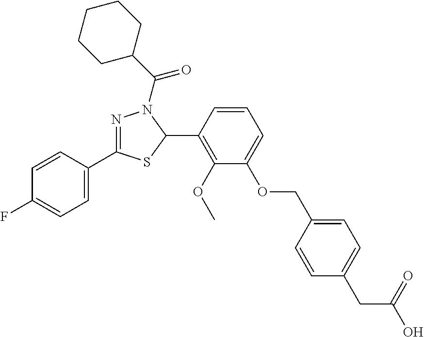 - MUHINHQLDXMQQT-UHFFFAOYSA-N COC1=C(F)C=C(C(=O)N2N=C(C3=CC=C(F)C=C3)SC2C2=C(OC)C(OCC3=CC(C(=O)O)=CC=C3)=CC=C2)C=C1 Chemical compound COC1=C(F)C=C(C(=O)N2N=C(C3=CC=C(F)C=C3)SC2C2=C(OC)C(OCC3=CC(C(=O)O)=CC=C3)=CC=C2)C=C1 MUHINHQLDXMQQT-UHFFFAOYSA-N 0.000 description 2