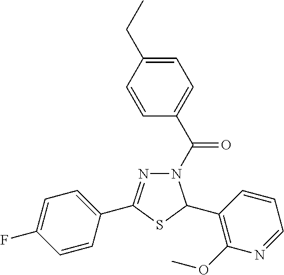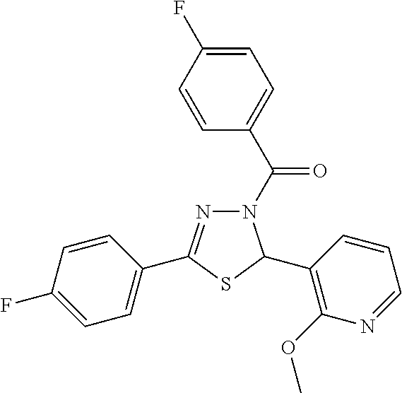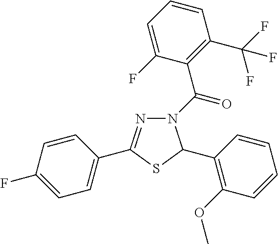 - TXVMZCHIYHOUFF-UHFFFAOYSA-N O=C(C1=CC(F)=CC=C1)N1N=C(C2=CC=C(Cl)C=C2)SC1C1=C(OC(F)F)C=CC=C1 Chemical compound O=C(C1=CC(F)=CC=C1)N1N=C(C2=CC=C(Cl)C=C2)SC1C1=C(OC(F)F)C=CC=C1 TXVMZCHIYHOUFF-UHFFFAOYSA-N 0.000 description 2