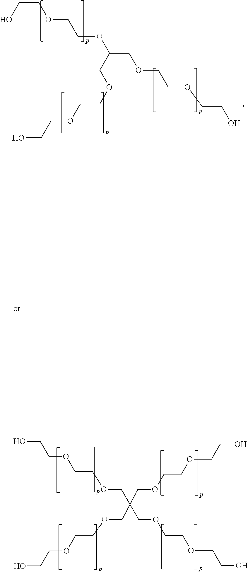 It should be understood that the value for q is calculated based on the ratio of the number of polymer moieties and the number of A-moieties. In other words, when q is 1.5, this contemplates, for example, the following formula I′: