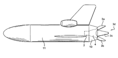 - FIGS. 4A to 4E is the case of a spacecraft made up of a space plane 11 fitted with atmospheric engines 9 for the atmospheric flight phases of the plane and fitted with an afterbody device comprising a cover element made up of two flaps 3 a , 3 b moving separately in a vertical plane to mask or uncover the rocket engine's nozzle.