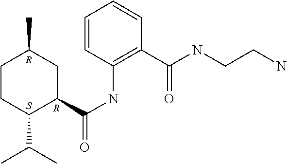 This Example discloses the experimental characterization and results of several exemplary small-molecule Trp-p8 modulators of Formula I, designated Compound I, II, III and IV. Their chemical formulas and molecular weight are summarized in Table 6.