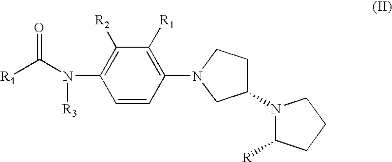 - 3-fluoro-N-[2-methyl-4-(2-(S)-methyl-[1,3′ (S)]bipyrrolidinyl-1′-yl)-phenyl]-benzamide;
