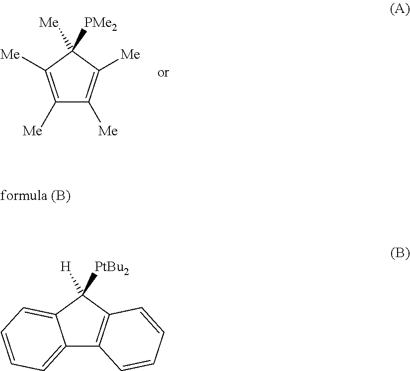 In an alternative embodiment R′ and R″ are joined together to form with the phosphorous atom a carbon-phosphorous monocycle comprising at least 3 carbon atoms or a carbon-phosphorous bicycle. The carbon-phosphorous monocycle is typically unsubstituted, but may also be substituted by at least one radical selected from the group of alkyl, cycloalkyl, aryl, alkoxy, and aryloxy radicals. Preferably, R′ and R″ are joined together to form a [3.3.1]- or [4.2.1]-phobyl radical with the phosphorous atom as depicted below.
