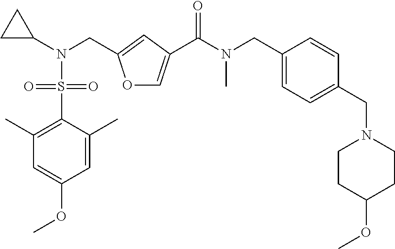 1H NMR (500 MHz, CD3OD): δ ppm 6.79 (2H, s), 5.03 (2H, s), 4.13-4.20 (2H, m), 3.86 (3H, s), 3.80-3.84 (2H, m), 2.92 (2H, d, J=11.7 Hz), 2.61 (6H, s), 2.52-2.59 (5H, m), 2.31 (3H, s), 2.29 (2H, d, J=7.3 Hz), 2.08 (2H, t, J=11.1 Hz), 1.83 (2H, br. s.), 1.62 (1H, ddd, J 11.1, 7.3, 3.7 Hz), 1.22-1.34 (2H, m), 0.59-0.66 (2H, m), 0.29-0.35 (2H, m)