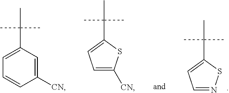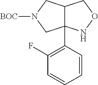 Scheme 1 depicts the formation of the Weinreb amide (2) used to form a ketone (3) that can then be transformed to an oxime. The oxime can be used to form the bicyclic isoxazole (9). The (A) group can be inserted at different points of the synthesis as shown in Scheme 1. “PG” is a protecting group developed for the amino group, such as carbamates and allyl. Such groups are well known and appreciated in the art.