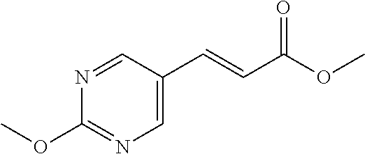 5-(2-Methyl-pyrimidin-5-ylmethyl)-2-methylsulfanyl-1H-pyrimidin-4-one (50 mg, 0.201 mmol, 1 eq) and 5-(2-Amino-ethyl)-2-(4-chloro-3-trifluoromethyl-phenoxy)-benzonitrile (110 mg, 1.6 eq) were heated in a sealed vial at 130° C. for 20 hours. Solvent was then evaporated and the resulting crude was purified by chromatography on BIOTAGE SP1 purification device using 10 g normal phase silica SNAP column and DCM/20% MeOH in DCM solvent system (gradient 5-50% of 20% MeOH in DCM in 25 column volumes). Solvent from the gathered fractions of appropriate composition was evaporated and the resulting oil was triturated with cyclohexane and diethyl ether to obtain 2-(4-chloro-3-trifluoromethyl-phenoxy)-5-{2-[5-(2-methyl-pyrimidin-5-ylmethyl)-4-oxo-1,4-dihydro-pyrimidin-2-ylamino]-ethyl}-benzonitrile (36 mg, yield=29.7%, purity=90%) in form of tain coloured powder. MS: [M+H]+=541.34. 1H NMR (300 MHz; CDCl3) δ/ppm 2.65 (s, 3H), 2.94 (t, J=7.02 Hz, 2H), 3.57 (s, 2H), 3.59-3.68 (m, 2H), 5.49 (br.s., 1H), 6.89 (d, J=8.61 Hz, 1H), 7.15 (dd, J=8.30 Hz, J=2.98 Hz, 1H), 7.38 (d, J=2.76 Hz, 1H), 7.44 (dd, J=8.82 Hz, J=1.91 Hz, 1H), 7.51 (d, J=8.51 Hz, 1H), 7.60 (d, J=2.02 Hz, 1H), 7.71 (s, 1H), 8.53 (s, 2H).