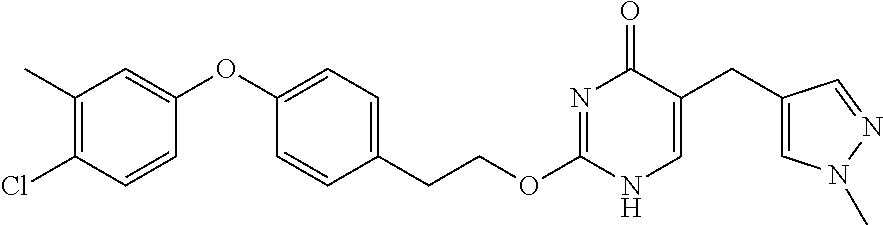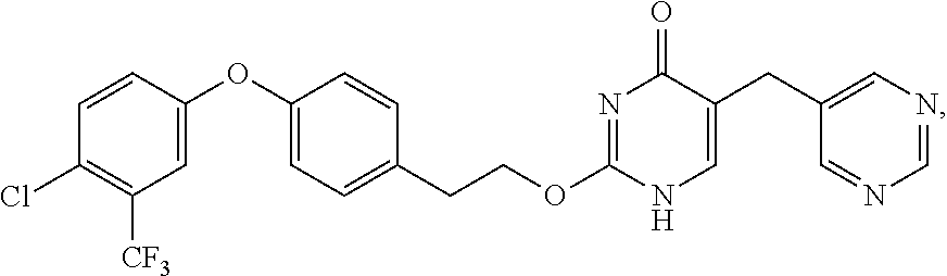 2-[4-(4-chloro-3-trifluoromethyl-phenoxy)-phenyl]-ethylamine (0.317 mmol, 1.0 eq) and 5-(6-chloro-pyridin-3-ylmethyl)-2-methylsulfanyl-1H-pyrimidin-4-one (0.190 mmol, 0.6 eq) were dissolved in dry ethanol (300 μL) and stirred at 130° C. overnight. Solvent was evaporated and crude product was purified on Biotage SP1 Snap Si 10; 15 ml/min in the gradient of MeOH in DCM: 0-7% in 15 CV. The appropriate fractions were combined and evaporated in vacuo to give the required product 5-(6-chloro-pyridin-3-ylmethyl)-2-{2-[4-(4-chloro-3-trifluoromethyl-phenoxy)-phenyl]-ethylamino}-1H-pyrimidin-4-one (0.084 mmol, yield: 26%, HPLC-MS/UV:[M+H]+=536.33; rt: 1.24 mins; purity: 95%). 1H NMR (300 MHz; CDCl3) δ/ppm 2.89 (t, J=7.17, 2H), 3.57 (s, 2H), 3.59-3.66 (m, 2H), 5.23 (br.s., 1H), 6.95 (dd, J=8.51, J=9.86, 2H), 7.03 (dd, J=9.41 J=2.24, 1H), 7.17-7.23 (m, 3H), 7.27-7.30 (m, 2H), 7.39 (dd, J=9.07, J=8.31, 1H), 7.47 (dd, J=8.06, J=2.51, 1H), 7.65 (s, 1H), 8.28 (d, J=2.26, 1H), 12.01 (br.s., 1H)
