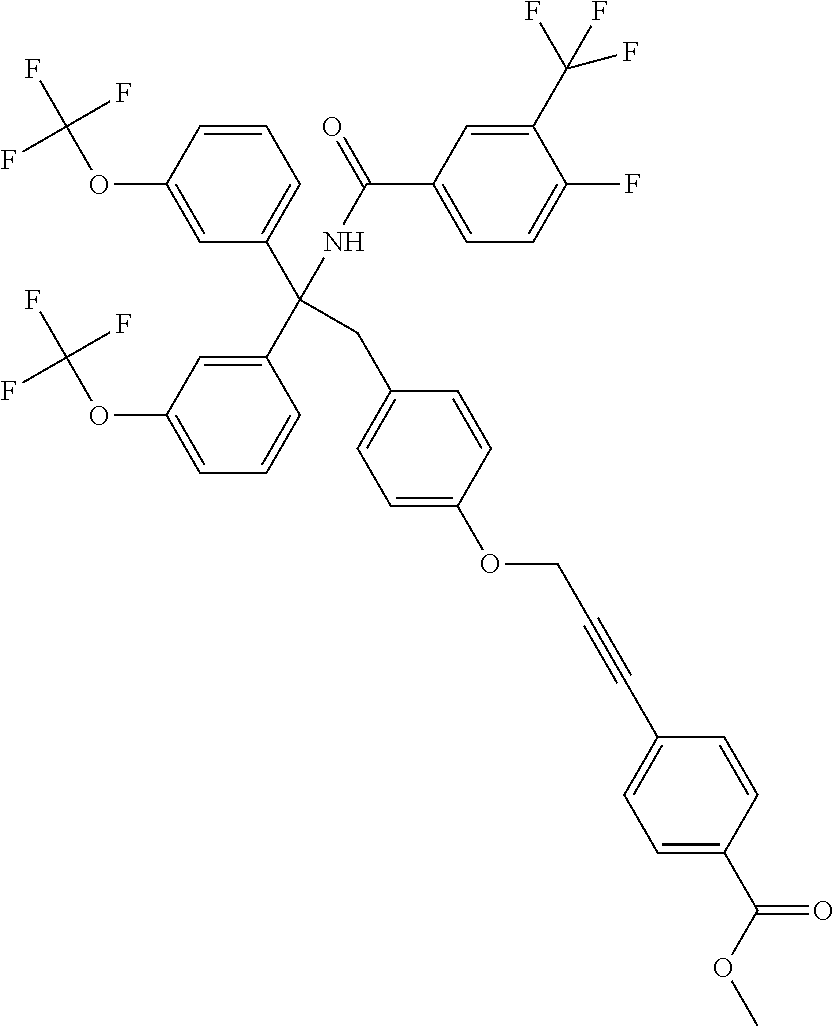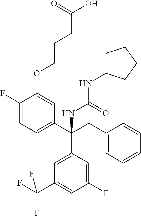 - XGHFIUPYACINHT-UHFFFAOYSA-N CCOC(=O)CCCC1=CC=C(C(CC2=CC=CC=C2)(NC(=O)NC2CCCC2)C2=CC(F)=CC(C(F)(F)F)=C2)C=C1 Chemical compound CCOC(=O)CCCC1=CC=C(C(CC2=CC=CC=C2)(NC(=O)NC2CCCC2)C2=CC(F)=CC(C(F)(F)F)=C2)C=C1 XGHFIUPYACINHT-UHFFFAOYSA-N 0.000 description 2