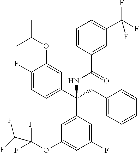 - FPMQZXGVJDIMFC-HHHXNRCGSA-N CC(C)OC1=CC([C@@](CC2=CC=CC=C2)(NC(=O)CCC(F)(F)F)C2=CC(OC(F)(F)C(F)F)=CC(F)=C2)=CC=C1F Chemical compound CC(C)OC1=CC([C@@](CC2=CC=CC=C2)(NC(=O)CCC(F)(F)F)C2=CC(OC(F)(F)C(F)F)=CC(F)=C2)=CC=C1F FPMQZXGVJDIMFC-HHHXNRCGSA-N 0.000 description 2
