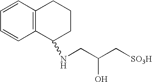 A solution of 3-chloro-2-hydroxy-1-propanesulfonic acid, sodium salt (2 g, 10 mmol) in water (9.75 mL total volume) was added over 8 hours to a mixture of 1,2,3,4-tetrahydro-1-nahtylamine (2 g, 13.6 mmol), water (10 mL) and 1,4-dioxane (4 mL) at 40° C. The mixture was stirred at this temperature for another 18 hours after the end of the addition. The reaction was not completed. The mixture was heated for 2 hours at reflux. The mixture was diluted with water (10 mL) and 50% w/w NaOH (0.25 mL) was added. The reaction mixture was extracted with chloroform (2×25 mL). It was then concentrated to a thick oil. The solution was applied on a Dowex 50 W 8 column (100 g). The fractions containing the product were concentrated, treated with activated charcoal (no effect) and freeze-dried. The desired material was obtained as a glassy solid (0.85 g, 3 mmol, 30%). The 1H and 13C NMR and MS were consistent with the structure.