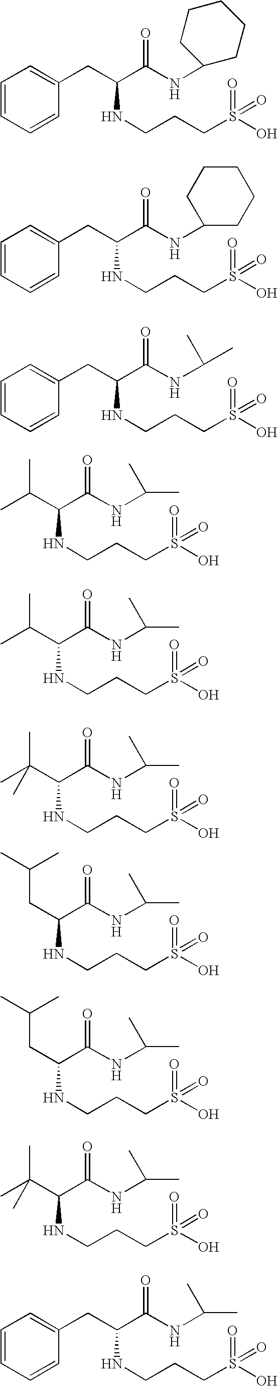 To the crude amine (240 mg, 1.34 mmol) in solution in THF (3 mL) was added 1,3-sultone (181 mg, 1.48 mmol) and the mixture was heated at reflux of THF for 12 hours. The suspension of was cooled down and filtered. The solid was dried to afford 270 mg of the homotaurin as a white solid (67% yield). 1H NMR (500 MHz, D2O) δ 1.11 (s, 6H), 2.00 (m, 2H), 2.67 (m, 2H), 2.80 (m, 2H), 3.12 (m, 2H), 3.74 (s, 3H), 6.90 (m, 2H), 7.14 (m, 2H), 8.61 (bs, 2H). ES-MS 272 (M−1). ES-MS 300 (M−1).