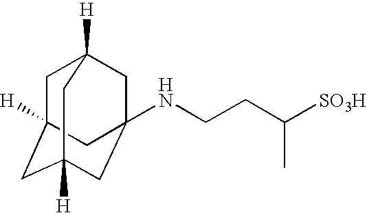 To an 80° C. solution of 2-adamantanamine hydrochloride (2.50 g, 13.3 mmol) and sodium hydroxide (586 mg, 14.6 mmol) in 1,4-dioxane (7 mL) and water (7 mL) was added via syringe pump (1 hour addition) a solution of 3-chloro-2-hydroxy-propane sulfonic acid, sodium salt (1.76 g, 8.9 mmol) in 1,4-dioxane (1 mL) and water (9 mL). The solution was stirred at 80° C. for an additional 4 hours. The reaction was cooled to room temperature. The solvent was evaporated under reduced pressure. The solid was suspended in EtOH (25 mL). The mixture was heated to reflux for 1 minute. The solid was removed by filtration. The pure product crystallized in the filtrate. The product was filtered, washed with EtOH (1×10 mL) and dried in vacuo. Yield: 30%. 1H NMR (D2O, 500 MHz) δ ppm 4.30 (m, 1H), 3.35 (m, 2H), 3.03 (m, 3H), 2.07 (m, 2H), 1.84 (m, 2H), 1.75 (m, 4H), 1.65 (d, 6H). 13C (D2O, 125 MHz) δ ppm 63.31, 55.03, 49.51, 36.51, 36.33, 36.26, 29.78, 29.23, 28.81, 26.63, 26.38. ES-MS 289 (M+1).