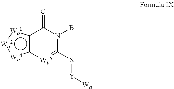 In some embodiments of the compound of Formula IX, the compound has a structure which is a member of the group consisting of: (i) Wa 1 is NR4, Wa 2 is CR5, Wa 4 is CR7, and Wb 5 is CR8; (ii) Wa 1 is NR4, Wa 2 is CR5, Wa 4 is CR7, and Wb 5 is CHR8; (iii) Wa 1 is NR4, Wa 2 is CR5, Wa 4 is CR7, and Wb 5 is N; (iv) Wa 1 is NR4, Wa 2 is CR5, Wa 4 is CR7, and Wb 5 is NR8; (v) Wa 1 is NR4, Wa 2 is N, Wa 4 is CR7, and Wb 5 is CR8; (vi) Wa 1 is NR4, Wa 2 is N, Wa 4 is CR7, and Wb 5 is CHR8; (vii) Wa 1 is NR4, Wa 2 is N, Wa 4 is CR7, and Wb 5 is N; (viii) Wa 1 is NR4, Wa 2 is N, Wa 4 is CR7, and Wb 5 is NR8; (ix) Wa 1 is NR4, Wa 2 is CR5, Wa 4 is N, and Wb 5 is CR8; (x) Wa 1 is NR4, Wa 2 is CR5, Wa 4 is N, and Wb 5 is CHR8; (xi) Wa 1 is NR4, Wa 2 is CR5, Wa 4 is N, and Wb 5 is N; (xii) Wa 1 is NR4, Wa 2 is CR5, Wa 4 is N, and Wb 5 is NR8; (xiii) Wa 1 is S, Wa 2 is CR5, Wa 4 is N, and Wb 5 is CR8; (xiv) Wa 1 is S, Wa 2 is CR5, Wa 4 is N, and Wb 5 is CHR8; (xv) Wa 1 is S, Wa 2 is CR5, Wa 4 is N, and Wb 5 is N; (xvi) Wa 1 is S, Wa 2 is CR5, Wa 4 is N, and Wb 5 is NR8; (xvii) Wa 1 is N, Wa 2 is CR5, Wa 4 is S, and Wb 5 is CR8; (xviii) Wa 1 is N, Wa 2 is CR5, Wa 4 is S, and Wb 5 is CHR8; (xix) Wa 1 is N, Wa 2 is CR5, Wa 4 is S, and Wb 5 is N; (xx) Wa 1 is N, Wa 2 is CR5, Wa 4 is S, and Wb 5 is NR8; (xxi) Wa 1 is CR5, Wa 2 is N, Wa 4 is S, and Wb 5 is CR8; (xxi) Wa 1 is CR5, Wa 2 is N, Wa 4 is S, and Wb 5 is CHR8; (xxii) Wa 1 is CR5, Wa 2 is N, Wa 4 is S, and Wb 5 is N; (xxiii) Wa 1 is CR5, Wa 2 is N, Wa 4 is S, and Wb 5 is NR8; (xxiv) Wa 1 is S, Wa 2 is N, Wa 4 is CR7, and Wb 5 is CR8; (xxv) Wa 1 is S, Wa 2 is N, Wa 4 is CR7, and Wb 5 is CHR8; (xxvi) Wa 1 is S, Wa 2 is N, Wa 4 is CR7, and Wb 5 is N; (xxvii) Wa 1 is S, Wa 2 is N, Wa 4 is CR7, and Wb 5 is NR8; (xxviii) Wa 1 is CR5, Wa 2 is N, Wa 4 is NR4, and Wb 5 is CR8; (xxix) Wa 1 is CR5, Wa 2 is N, Wa 4 is NR4, and Wb 5 is CHR8; (xxx) Wa 1 is CR5, Wa 2 is N, Wa 4 is NR4, and Wb 5 is N; (xxxi) Wa 1 is CR5, Wa 2 is N, Wa 4 is NR4, and Wb 5 is NR8; (xxxii) Wa 1 is CR5, Wa 2 is CR5, Wa 4 is S, and Wb 5 is CHR8; (xxxiii) Wa 1 is CR5, Wa 2 is CR5, Wa 4 is S, and Wb 5 is CR8; (xxxiv) Wa 1 is CR5, Wa 2 is CR5, Wa 4 is S, and Wb 5 is N; and (xxxv) Wa 1 is CR5, Wa 2 is CR5, Wa 4 is S, and Wb 5 is NR8.