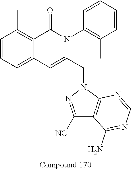 The results as shown in FIG. 2 further show that under the conditions tested compounds #7 and #53 exhibit 3.4 and 6.5-fold reductions respectively in IgG3 levels relative to vehicle control mice at a 30 mg/kg dose level. FIG. 2 further shows that compound #53 exhibits 29.9-fold reduction in IgG3 levels relative to vehicle control mice at a 60 mg/kg dose level under the conditions tested,