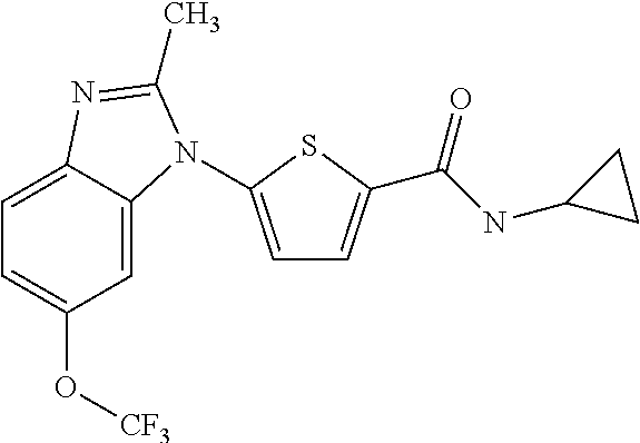 - KQUZVFUUJYDGHG-UHFFFAOYSA-N CC1=NC2=CC=C(OC(F)(F)F)C=C2N1C1=CC=C(C(=O)NC2CC2)S1 Chemical compound CC1=NC2=CC=C(OC(F)(F)F)C=C2N1C1=CC=C(C(=O)NC2CC2)S1 KQUZVFUUJYDGHG-UHFFFAOYSA-N 0.000 description 1