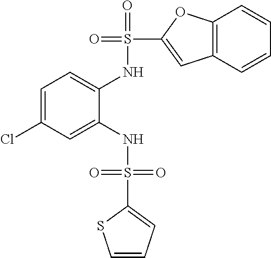 WO 2001028537 discloses preparation of bissulfonamide derivatives as inhibitors of dehydroquinate synthetase and type II dehydroquinase enzymes. Compounds N,N′-(4-chloro-1,2-phenylene)bis-2-thiophenesulfonamide (CAS 335336-21-5) and N,N′-(4-chloro-5-methyl-1,2-phenylene)bis-)2-thiophenesulfonamide (CAS 335335-03-0) are disclosed in WO 2001028537.